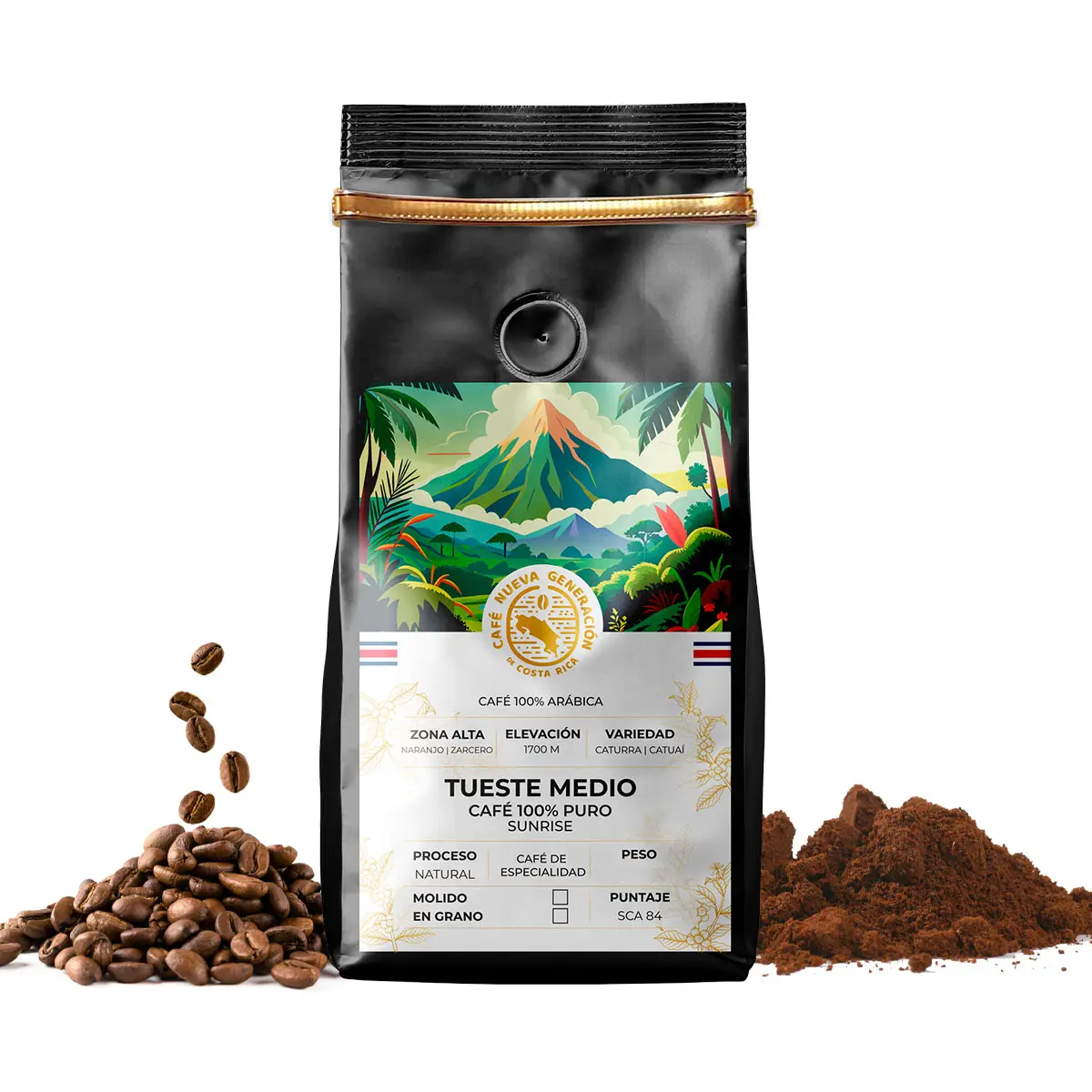 Los granos de tueste medio son un poco más oscuros y complejos. Los azúcares del interior de los granos han empezado a caramelizarse, y el café tendrá un sabor natural ligeramente dulce.